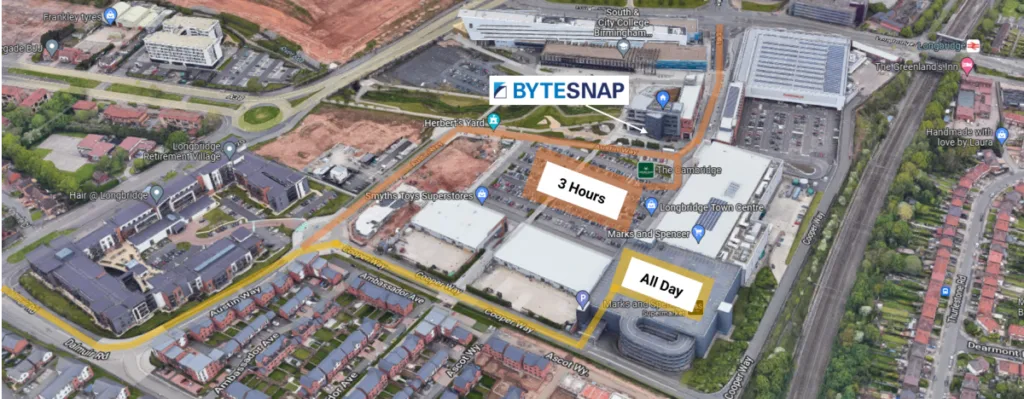 Park Point is the tall, grey building by the open-air car park. In reception, take the lift up to the 3rd floor and you’ll find ByteSnap there.